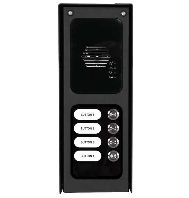 4 TASTI - Citofono GSM Multi utente con 4 TASTI ; Protezione IP65 -20°C + 60°C ; Costruito in ACCIAIO INOX MARINO B316 ; Verniciato a polvere nero ; Supporto 4G HD VOICE ; Gestione 2 aperture con due relè a bordo ; Tasti di chiamata retro illuminati ; Chiamata fino a 3 numeri per ogni tasto ; Programmazione da App ; Programmazione oraria ; Funzione DND ; Supporto Caller ID apertura su riconoscimento numero ; Alimentazione 24V AC
