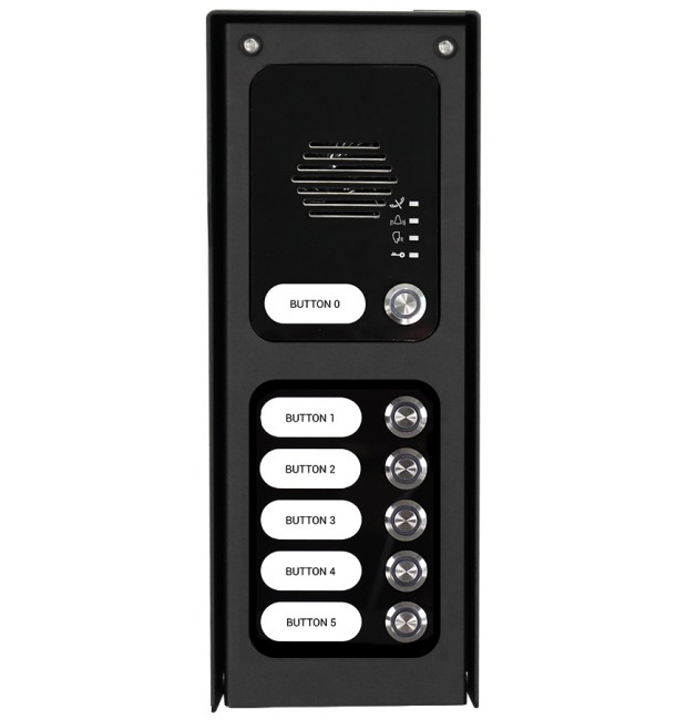 6 TASTI - Citofono GSM Multi utente con 6 TASTI ; Protezione IP65 -20°C + 60°C ; Costruito in ACCIAIO INOX MARINO B316 ; Verniciato a polvere nero ; Supporto 4G HD VOICE ; Gestione 2 aperture con due relè a bordo ; Tasti di chiamata retro illuminati ; Chiamata fino a 3 numeri per ogni tasto ; Programmazione da App ; Programmazione oraria ; Funzione DND ; Supporto Caller ID apertura su riconoscimento numero ; Alimentazione 24V AC