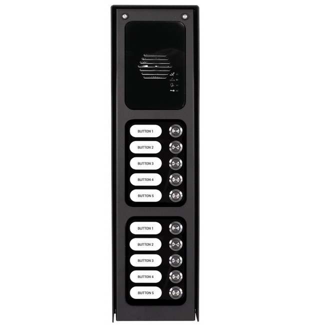 10 TASTI - Citofono GSM Multi utente con 10 TASTI ; Protezione IP65 -20°C + 60°C ; Costruito in ACCIAIO INOX MARINO B316 ; Verniciato a polvere nero ; Supporto 4G HD VOICE ; Gestione 2 aperture con due relè a bordo ; Tasti di chiamata retro illuminati ; Chiamata fino a 3 numeri per ogni tasto ; Programmazione da App ; Programmazione oraria ; Funzione DND ; Supporto Caller ID apertura su riconoscimento numero ; Alimentazione 24V AC