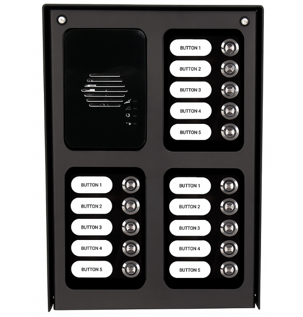 15 TASTI - Citofono GSM Multi utente con 15 TASTI ; Protezione IP65 -20°C + 60°C ; Costruito in ACCIAIO INOX MARINO B316 ; Verniciato a polvere nero ; Supporto 4G HD VOICE ; Gestione 2 aperture con due relè a bordo ; Tasti di chiamata retro illuminati ; Chiamata fino a 3 numeri per ogni tasto ; Programmazione da App ; Programmazione oraria ; Funzione DND ; Supporto Caller ID apertura su riconoscimento numero ; Alimentazione 24V AC