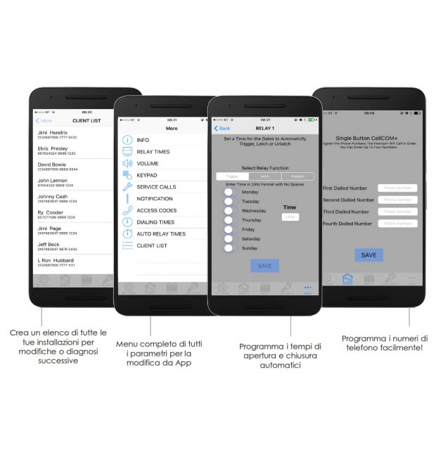 -Calendario 7 giorni per programmare apertura e chiusura cancello automatizzata -Notifica via SMS ad apertura cancello -Programmazione remota via App iOS & Android e PC -Invio log di attività via SMS -Tempi di suonata e durata chiamata programmabili -Fino a 250 "codici di accesso visitatori" -Fino a 250 codici di accesso con fasce orarie per servizi di pulizie ecc... -Funzione non disturbare -Apertura e chiusura automatica cancello su fasce orarie |