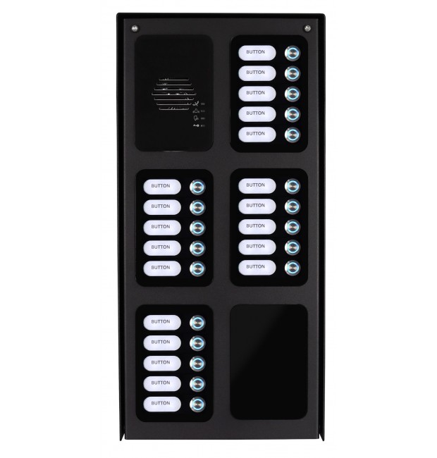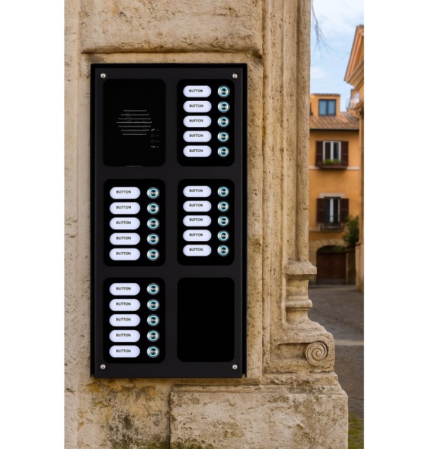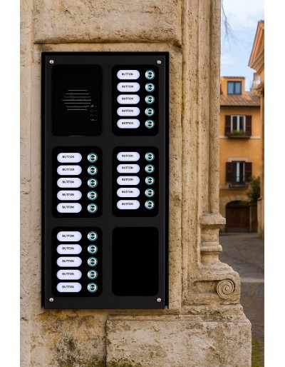 20 TASTI - Citofono GSM Multi utente con 20 TASTI ; Protezione IP65 -20°C + 60°C ; Costruito in ACCIAIO INOX MARINO B316 ; Verniciato a polvere nero ; Supporto 4G HD VOICE ; Gestione 2 aperture con due relè a bordo ; Tasti di chiamata retro illuminati ; Chiamata fino a 3 numeri per ogni tasto ; Programmazione da App ; Programmazione oraria ; Funzione DND ; Supporto Caller ID apertura su riconoscimento numero ; Alimentazione 24V AC