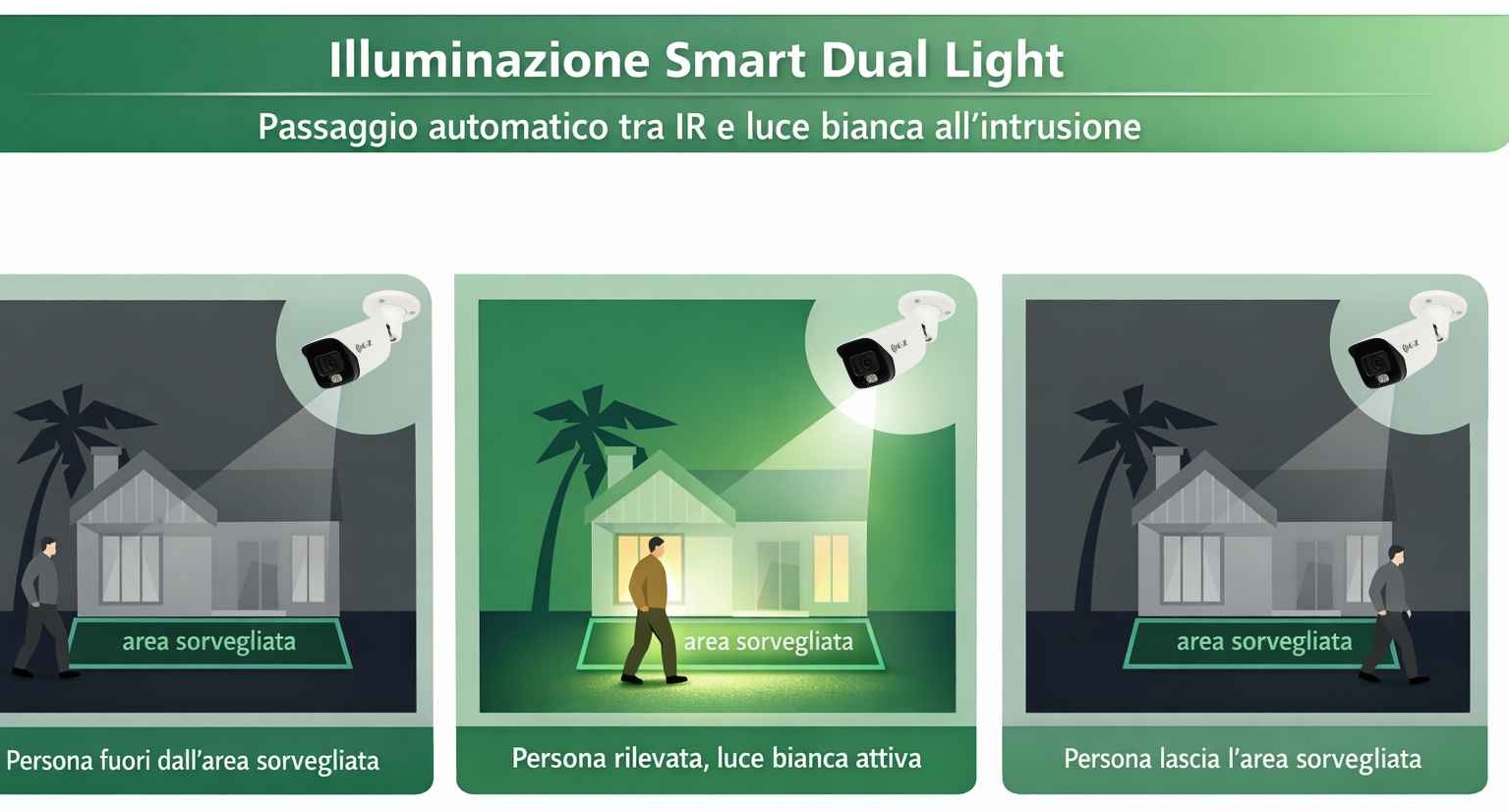 In modalità automatica, la telecamera utilizza normalmente l’infrarosso per garantire visione discreta in bianco e nero fino a circa 50 metri. Quando viene rilevata un’intrusione tramite analisi video (persona o veicolo), i LED bianchi si attivano automaticamente illuminando l’area a colori, migliorando il dettaglio dell’immagine e creando un immediato effetto di deterrenza attiva.