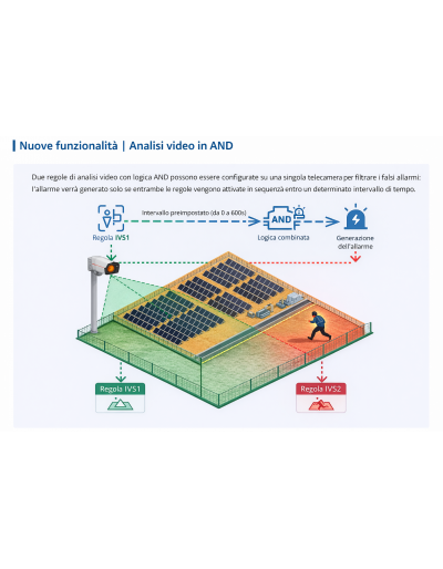 • Analisi video avanzata con doppia regola in AND: allarme solo se due regole vanno in allarme entro un tempo in secondi configurabile.