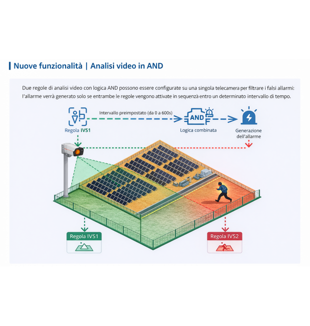 L’allarme viene generato solo quando due regole IVS diverse vanno in allarme entro un intervallo minimo/massimo impostabile in secondi. Questo valida l’evento e riduce i falsi allarmi tipici degli ambienti outdoor.