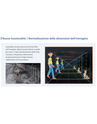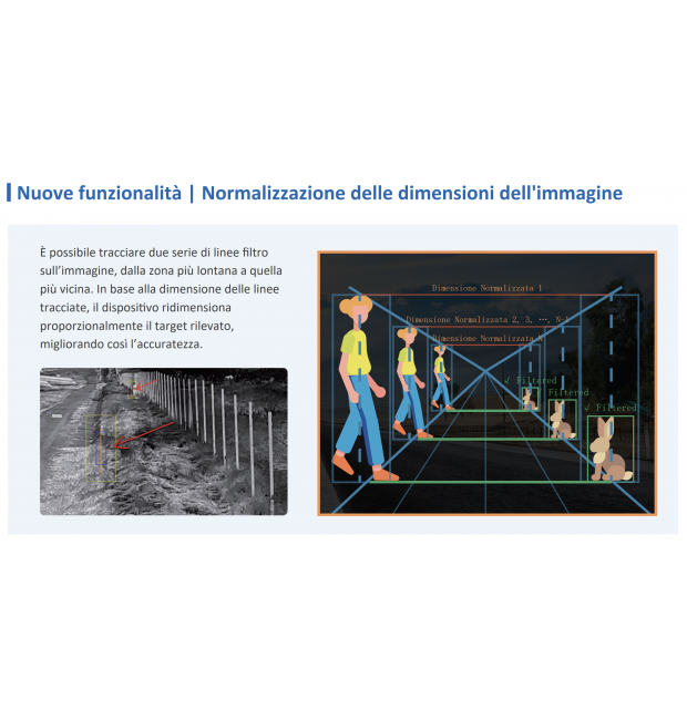 Un limite frequente dei sistemi IVS classici è la dimensione minima “fissa”: funziona bene solo in una porzione della scena. La GZ-TH7F8 introduce un filtro dimensionale evoluto che si adatta alla distanza e normalizza la dimensione del target lungo l’inquadratura. In pratica, mentre una persona si avvicina o si allontana, il filtro esegue un auto-resize coerente con la prospettiva reale.