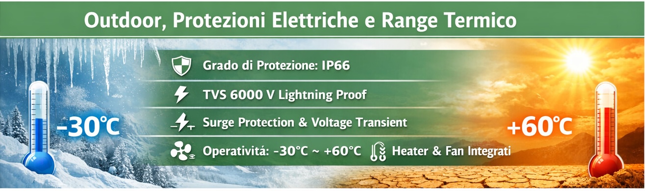 Struttura IP66 con protezioni elettriche dedicate ad ambienti esterni: TVS 6000 V lightning proof, surge protection e voltage transient protection. Presenza di heater e fan integrati per operatività su –30°C ~ +60°C, utile in installazioni soggette a gelo, umidità o alte temperature in estate.
